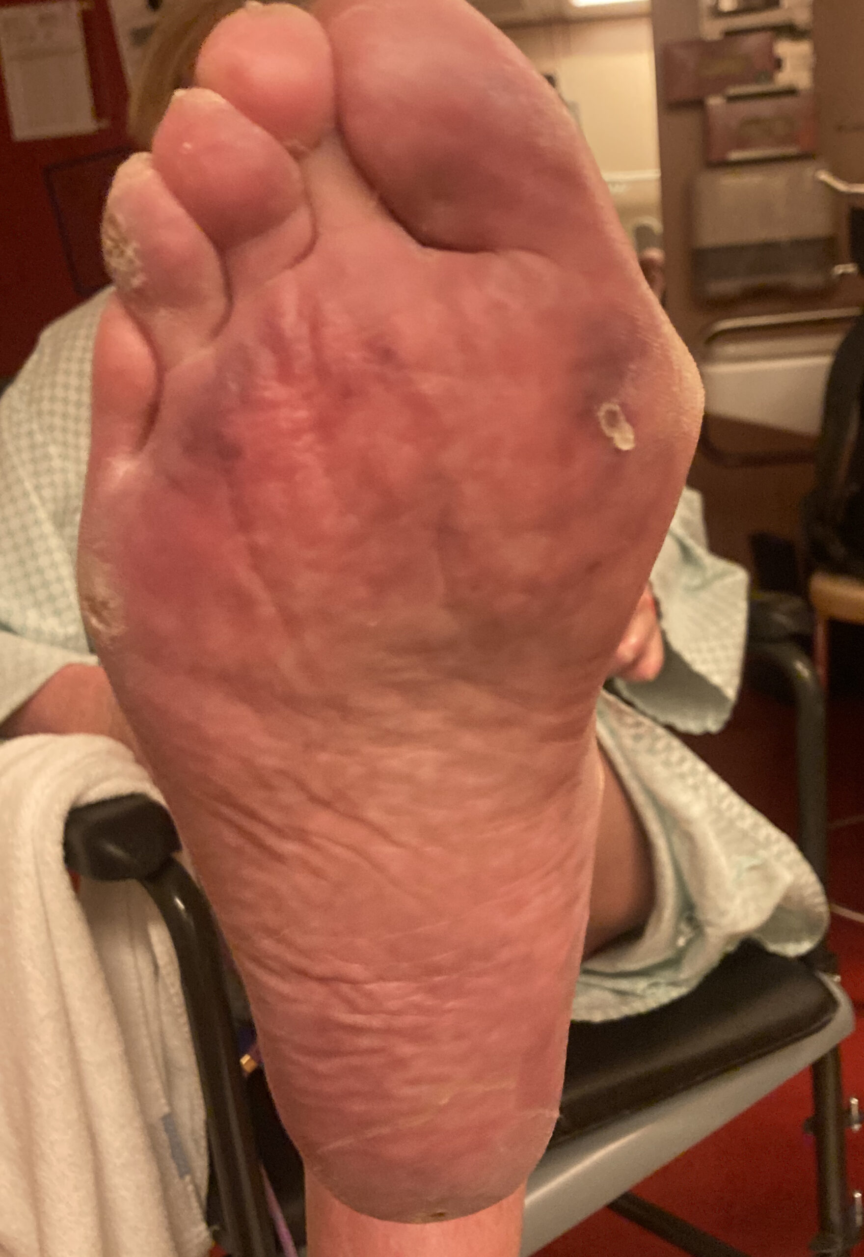Die Fußsohle einer Patientin mit Sklerodermie mit typisch rötlich verfärbten Arealen besonders oben seitlich